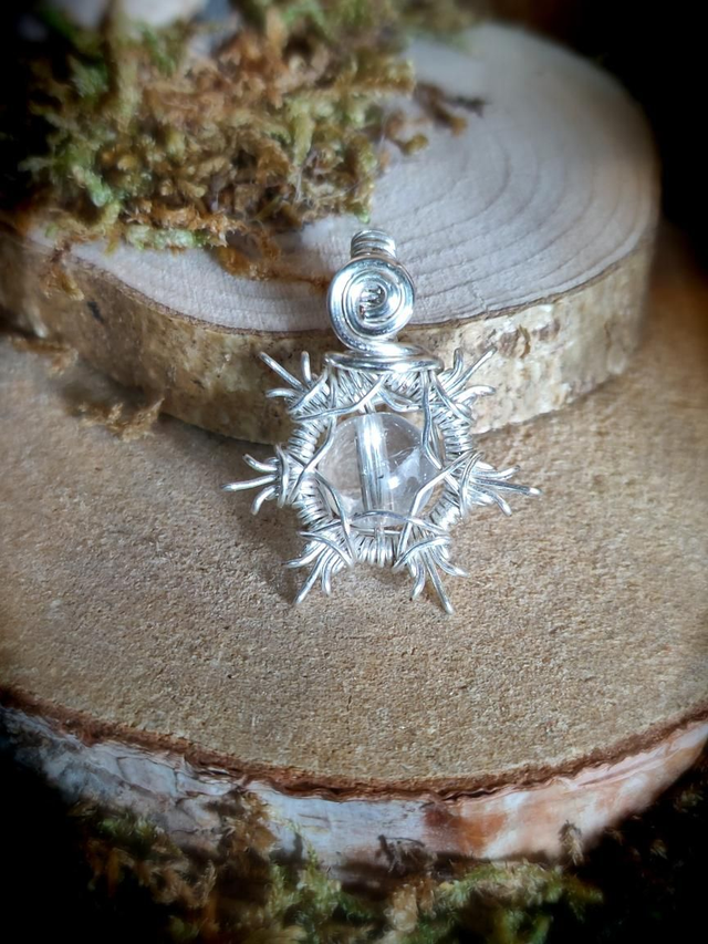 ❄️ Laissez-vous envoûter par la délicatesse de ce pendentif flocon de neige, confectionné avec passion grâce à la technique du wire-wrapping. Le cuivre plaqué argenté forme une structure complexe et détaillée, rappelant la perfection éphémère d'un flocon de givre.