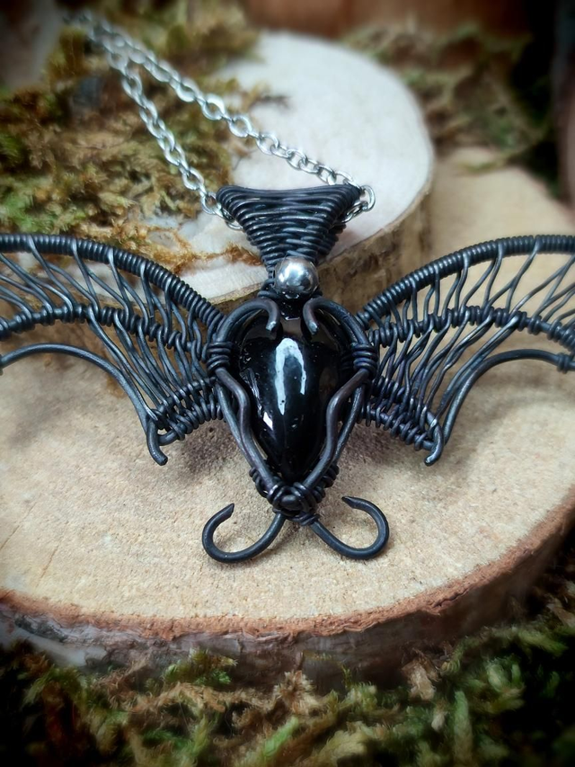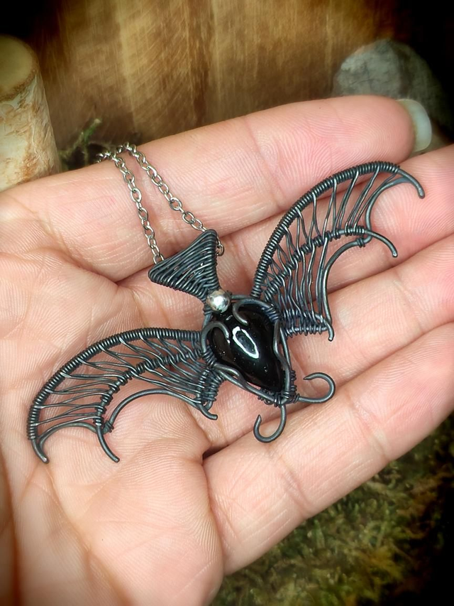 Ce pendentif de chauve-souris en wire-wrapping, forgé dans le cuivre noirci et orné d'une obsidienne, n'est pas qu'un simple bijou ; c'est un fragment de nuit capturé, un écho silencieux des légendes ancestrales.