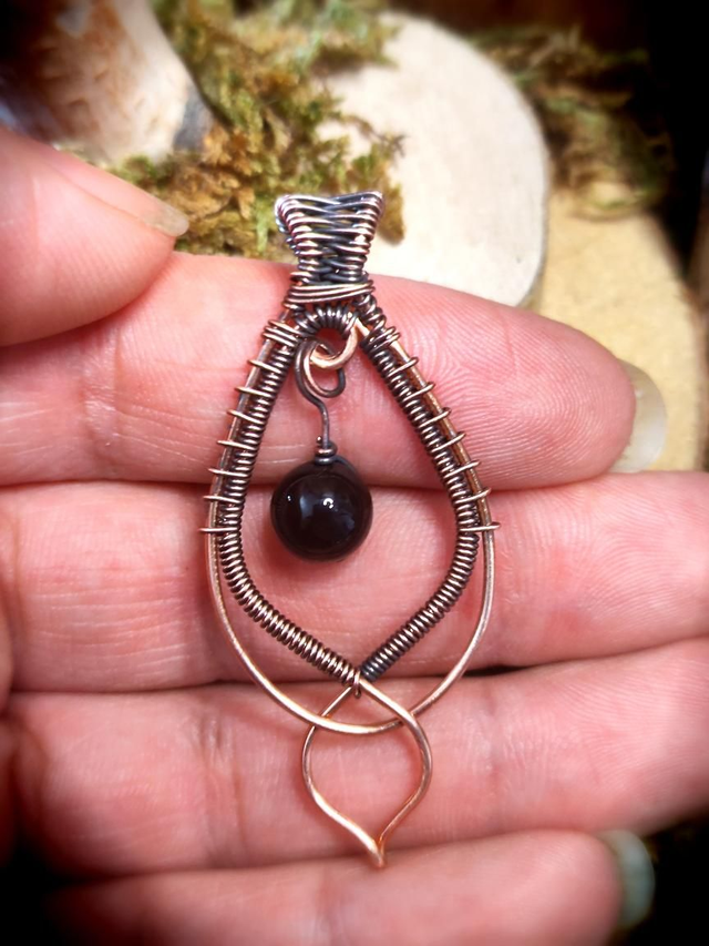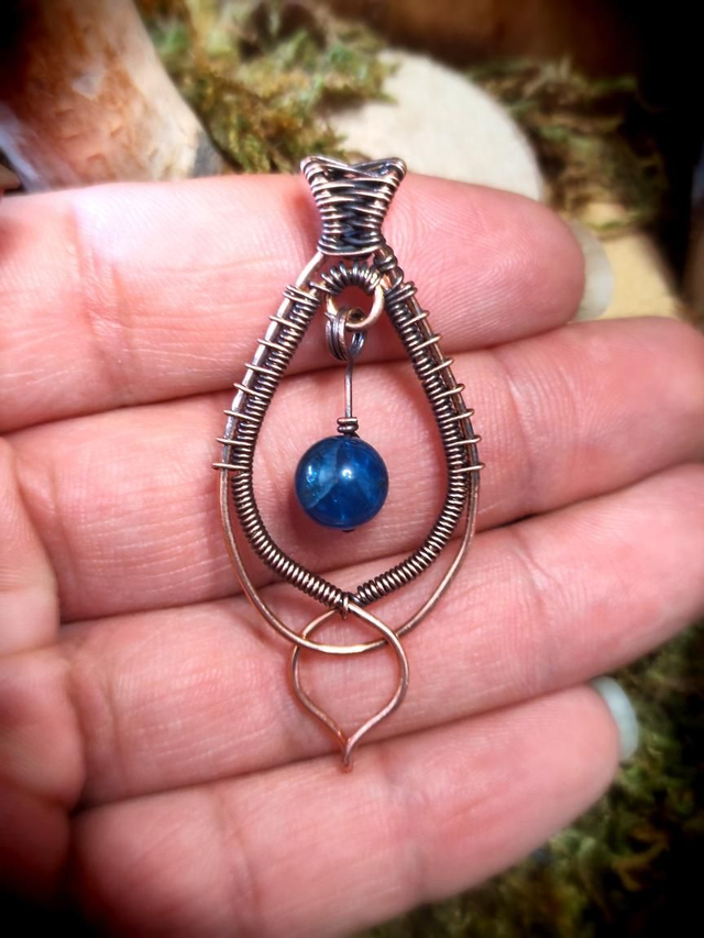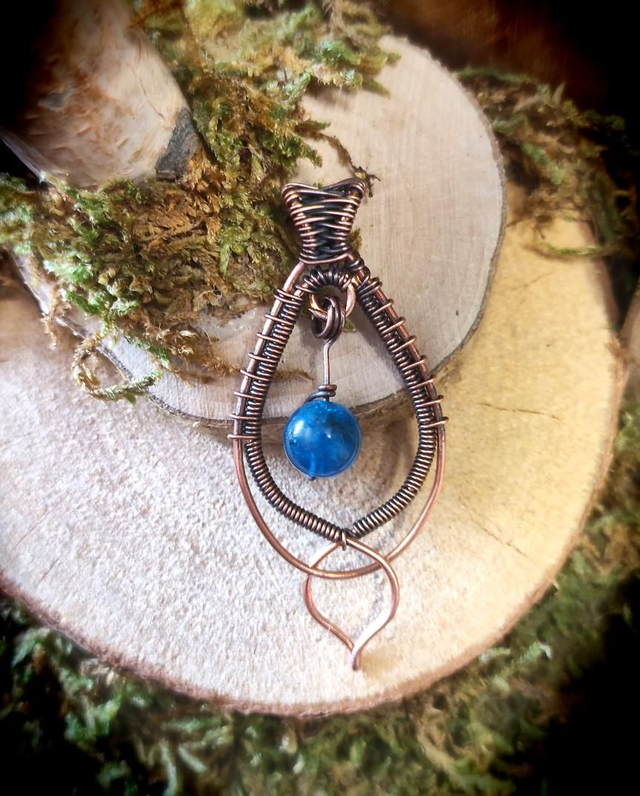Laissez-vous envoûter par la magie de ce délicat pendentif, réalisée à la main. De fins fils de cuivre, chaleureux et brillants, s'entrelacent avec grâce pour former une cage aérienne aux courbes douces et organiques, évoquant l'élégance intemporelle dans un style celtiques.
